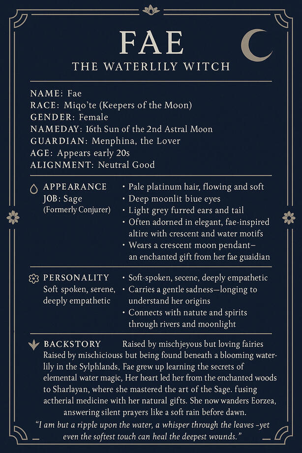 Quote: "I am but a ripple upon the water, a whisper through the leaves — yet even the softest touch can heal the deepest wounds."Quick intro: A lone Miqo'te child discovered beneath a blooming waterlily by a circle of mischievous but kind-hearted fairies. They named her Fae, after the magical beings who raised her, and nurtured her amidst glimmering light and perpetual song.Background: Born of mortal parents, the fae imbued Fae with ancient elemental blessings—most notably, dominion over water. With a flick of her slender fingers, she could summon rippling streams, coax dew from the air, or soothe wounds with the gentle caress of rain. Her control over water was not one of violence, but of nurture—reflecting the care she had known growing up in a world where laughter danced like wind through leaves.Now a young woman, Fae roams Eorzea not as a warrior, but as a wandering healer and protector. Her pale furred ears twitch at the sound of distress, and her piercing blue eyes—like still pools under moonlight—see the pain others hide. Though she holds herself with quiet grace, there is an undercurrent of sadness: a yearning to understand the world of her birth, and why she was left behind.During her travels, Fae encountered scholars from the distant city of Sharlayan. Fascinated by their knowledge and drawn to their healing arts, she took up the ways of the Sage—an ancient discipline that combined aetherial medicine with martial prowess. Armed with her shimmering nouliths—four floating foci of energy—Fae wove her water magic together with the Sage’s techniques, creating barriers, mending wounds, and striking down those who threatened the innocent, all with effortless, fluid grace.Despite her longing, she remains tethered to the fairies by the crescent moon pendant at her throat—an enchanted gift from her fae mother that glows whenever she is near water or in need of guidance.Legends among Gridanian folk speak of a “Waterlily Witch” who heals the broken and whispers to rivers. They say she travels where the water calls her—and that if you leave a lily by the stream at night, she may answer your silent prayer.