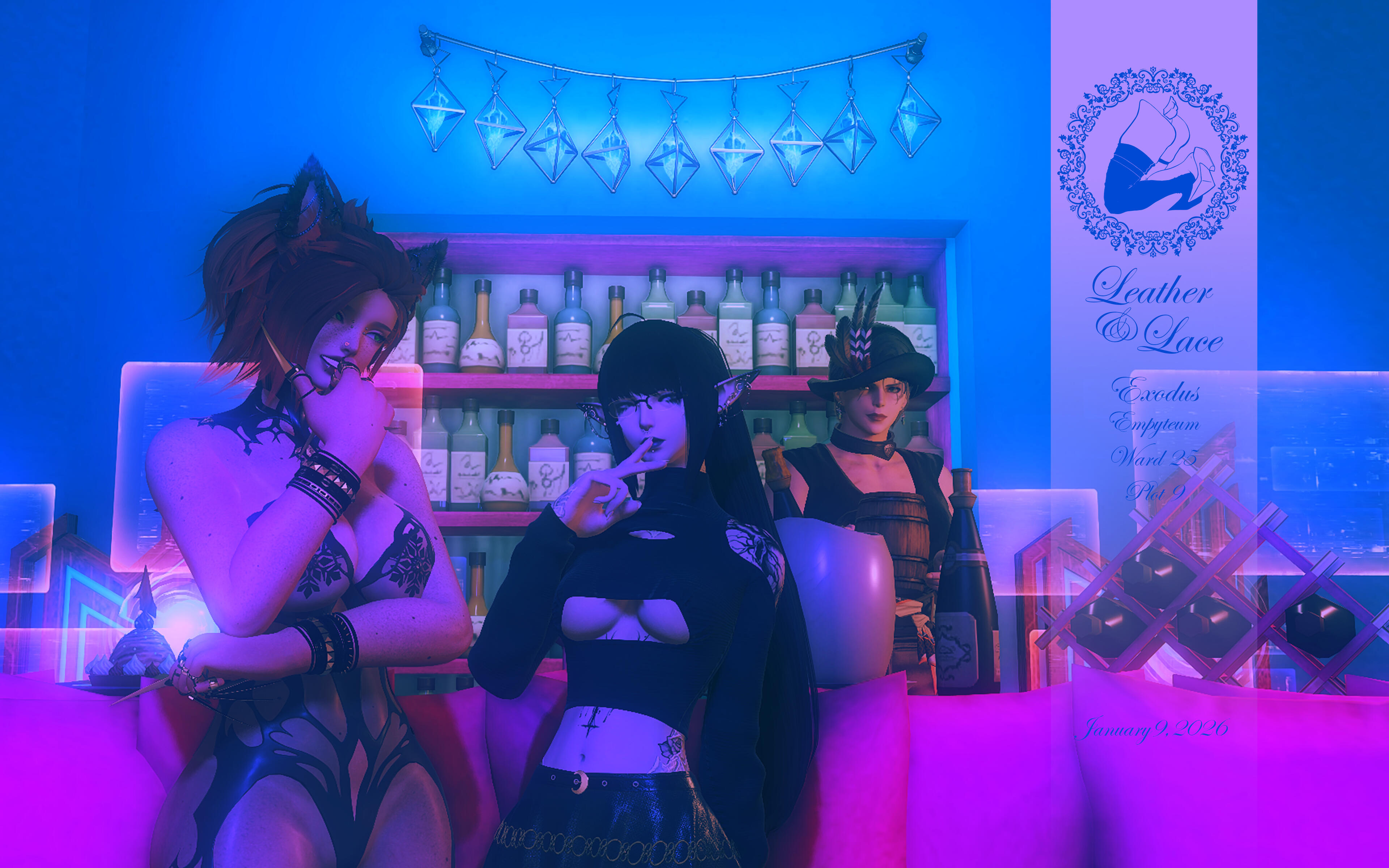 Leather & Lace is a 21+ NSFW FFXIV roleplay venue, founded by Stephie Mierqid and Krzystovia O'thuaidh. This project's objective is to create a fun and exciting roleplay space free of hype, drama, and other extraneous rubbish. Our staff are skilled roleplayers, dedicated to creating a casual and character-driven experience for all of our guests. Central to our philosophy are the following tenets: